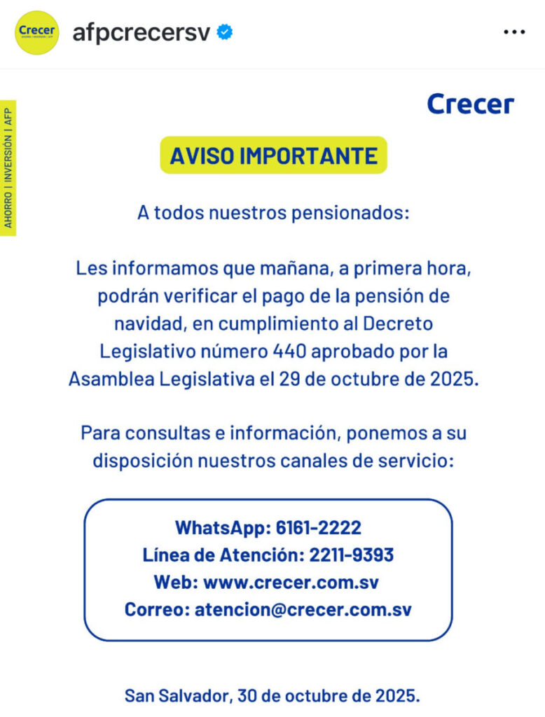«Les informamos que mañana, a primera hora, podrán verificar el pago de la pensión de navidad, en cumplimiento con el decreto legislativo número 440 aprobado por la Asamblea Legislativa el 29 de octubre de 2025», anunció CRECER. Puso a disposición su línea de atención 2211-9393, WhastApp 6161-2222 y correo atencion@crecer.com.sv.