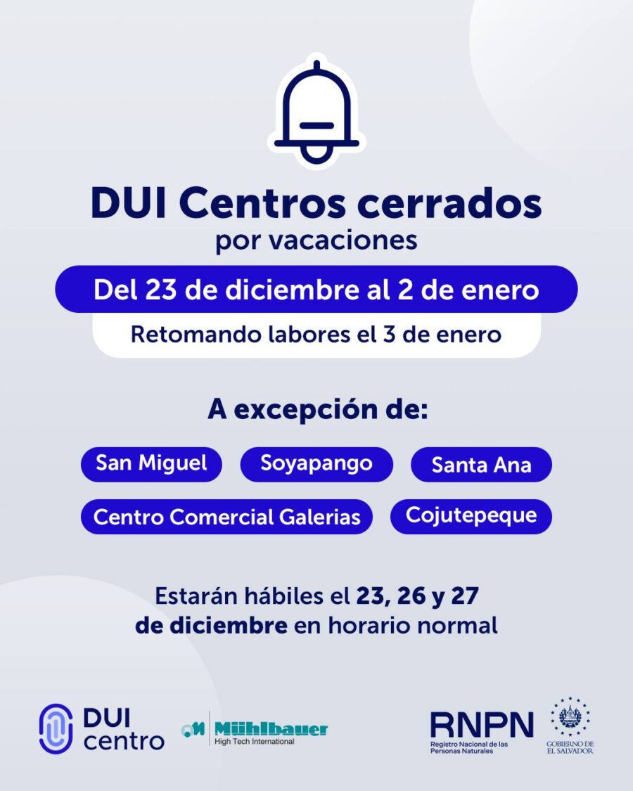Asimismo, el Registro Nacional de las Personas Naturales (RNPN) también informó que su oficina central ubicada sobre la alameda Manuel Enrique Araujo estará cerrada a partir de este 23 de diciembre y hasta el viernes 2 de enero.