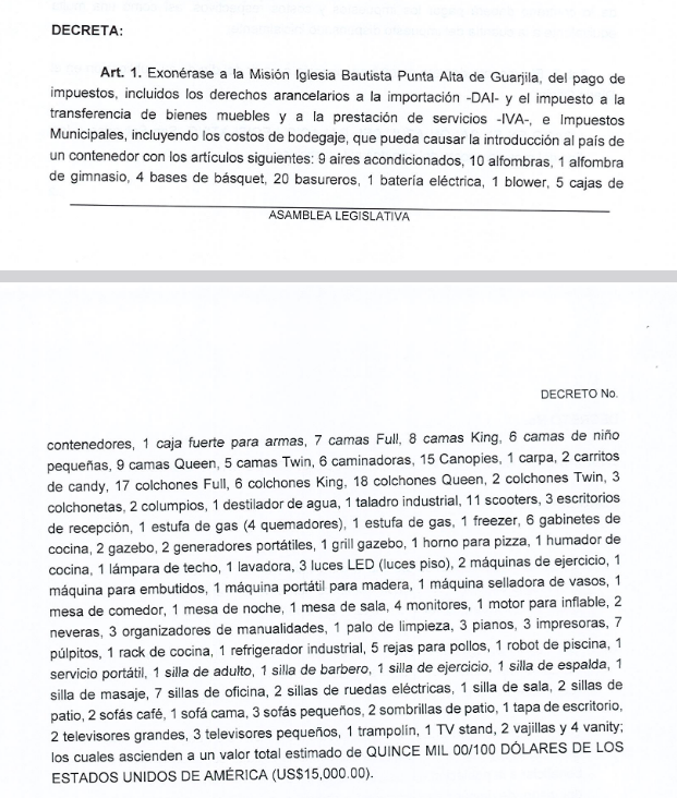 La Comisión de Hacienda de la Asamblea Legislativa aprobó este lunes un dictamen favorable para exonerar del pago de todo tipo de impuestos y bodegaje la introducción de un contenedor con artículos como aires acondicionados, camas, caminadoras, entre otros, que fue donado a la Misión Iglesia Bautista Punta Alta de Guarjila, en Chalatenango.
