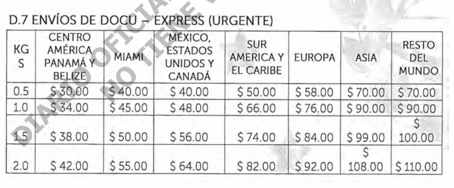 Las tarifas de envío de documentos o paquetes para Estados Unidos es de $45 por un peso de 500 gramos; para Centroamérica es $25.00; de esa tarifa por cada 500 gramos aumenta en tarifa $2.75. La tarifa para México es $30, y por cada 500 gramos extra, aumenta $3.