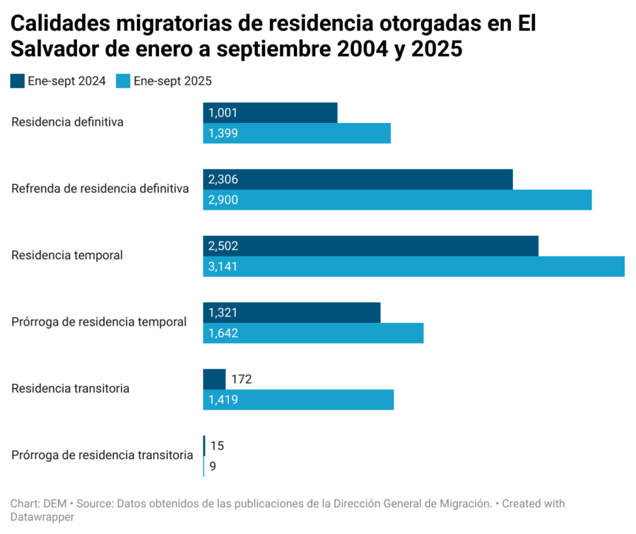 El otorgamiento de residencias definitivas y temporales, así como las refrendas o prórrogas de las ya existentes, ha aumentado en al menos 43 % en los primeros nueve meses del año 2025 respecto al mismo periodo del año pasado, según datos de la Dirección General de Migración y Extranjería de El Salvador.