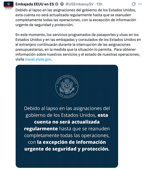 La Embajada de Estados Unidos en El Salvador informó que debido al atraso en las asignaciones presupuestarias en el gobierno de los Estados Unidos, por falta de aprobación presupuestaria, las cuentas de redes sociales de la oficina diplomática no serán actualizadas hasta que se reanuden operaciones, excepto información urgente sobre seguridad y protección.