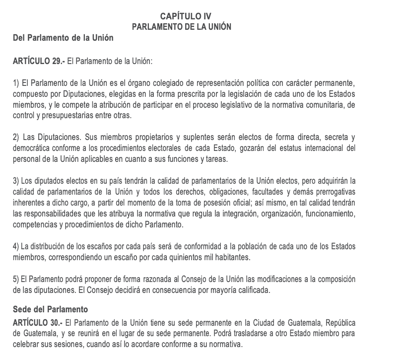 La propuesta de reforma puede encontrarse en el sitio web de la Presidencia. Esta propuesta indica que el “Parlamento de la Unión” es el órgano colegiado de representación política con diputaciones al cual le “compete la atribución de participar en el proceso legislativo de la normativa comunitaria, de control y presupuestarias.