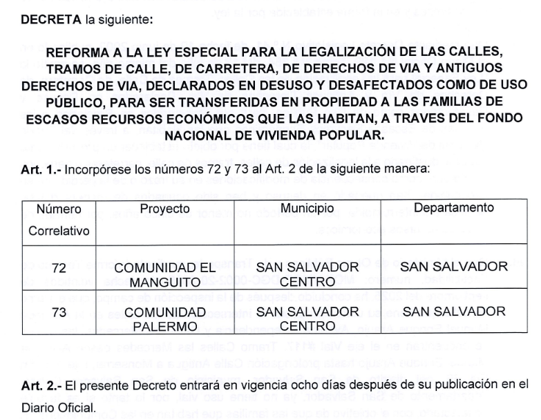 En la gestión actual, la primer inclusión de una comunidad en la normativa se aprobó el 13 de enero de 2020. A partir de esa fecha, la gestión legislativa de Nuevas Ideas ha incluido 14 comunidades, incluidas El Manguito y Palermo.