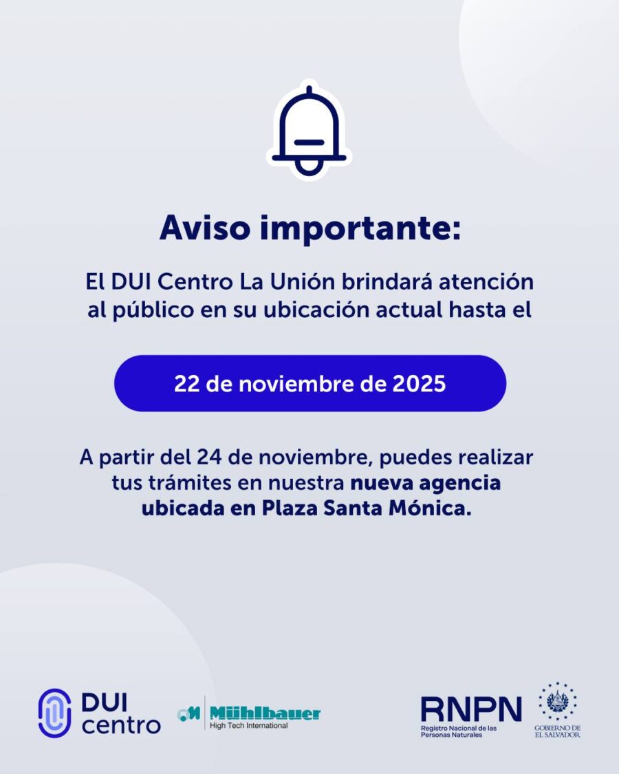 Los ciudadanos que deseen realizar trámites de su Documento Único de Identidad (DUI) deben acercarse a la nueva oficina en la Plaza Santa Mónica a partir del lunes 24 de noviembre. La entidad indicó que el cambio responde al principio de «comodidad» de los usuarios.