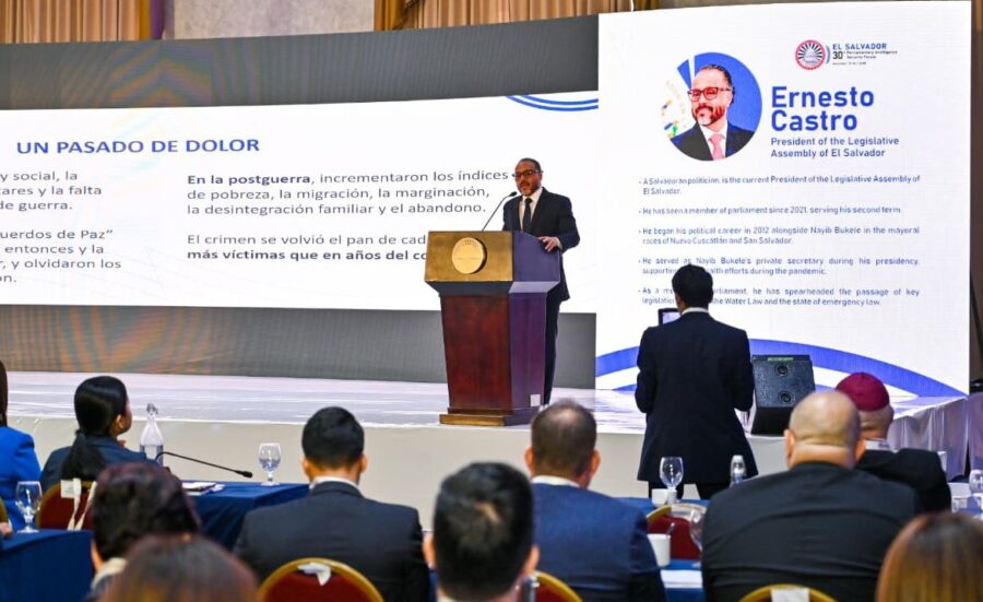 El presidente de la Asamblea Legislativa, Ernesto Castro, participó este jueves en el 30.º Foro Parlamentario de Inteligencia y Seguridad que se desarrolla en San Salvador, donde defendió las decisiones impulsadas desde el Congreso, entre ellas el régimen de excepción, y subrayó que los tres Órganos del Estado operan bajo una misma visión para garantizar la seguridad en el país.