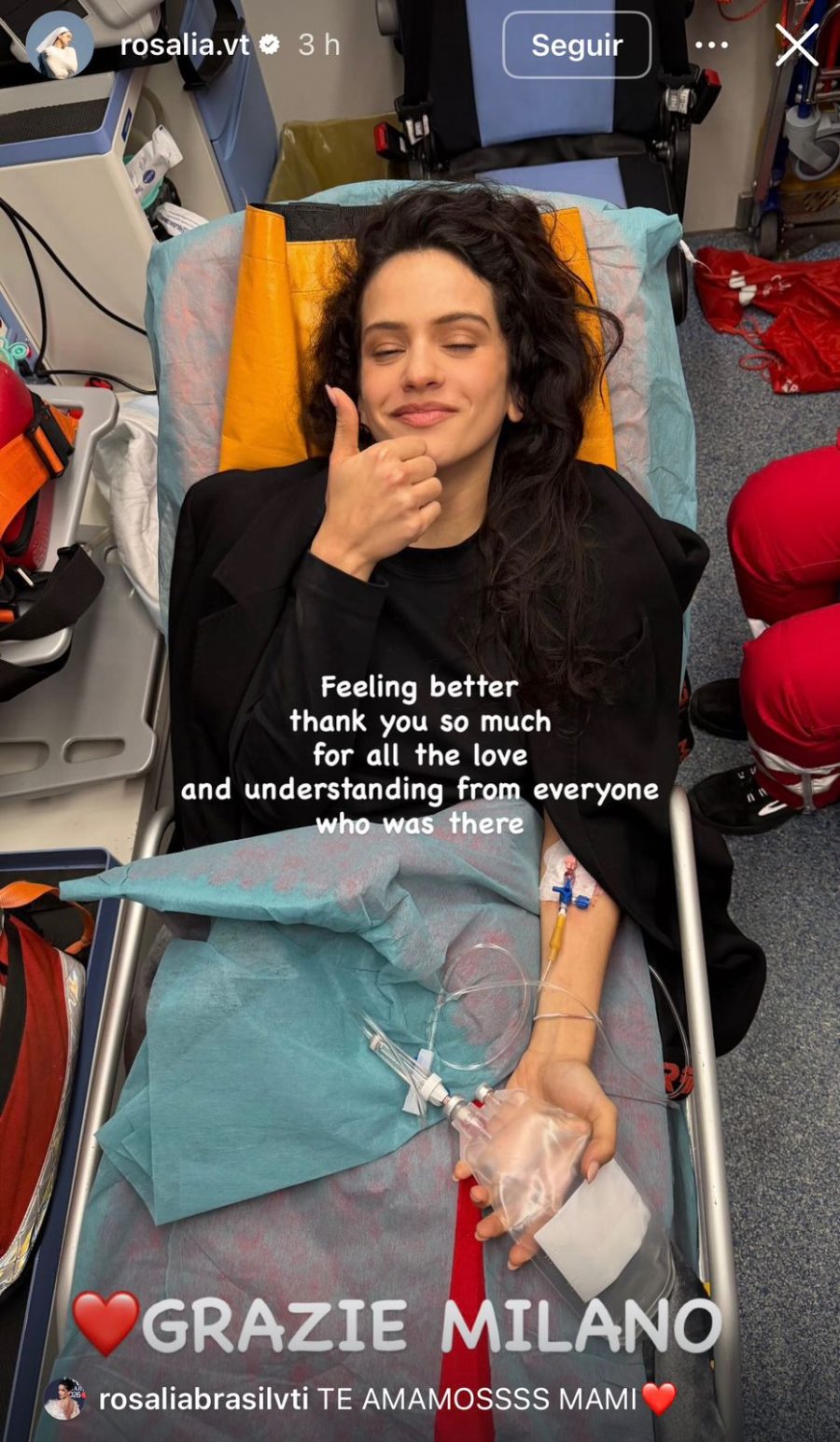 A través de su perfil de Instagram, la cantante catalana compartió una imagen desde lo que parece ser un centro hospitalario o unidad sanitaria móvil, en la que se la ve descansando en una camilla, con una vía intravenosa pero mostrando el pulgar hacia arriba en señal de recuperación.