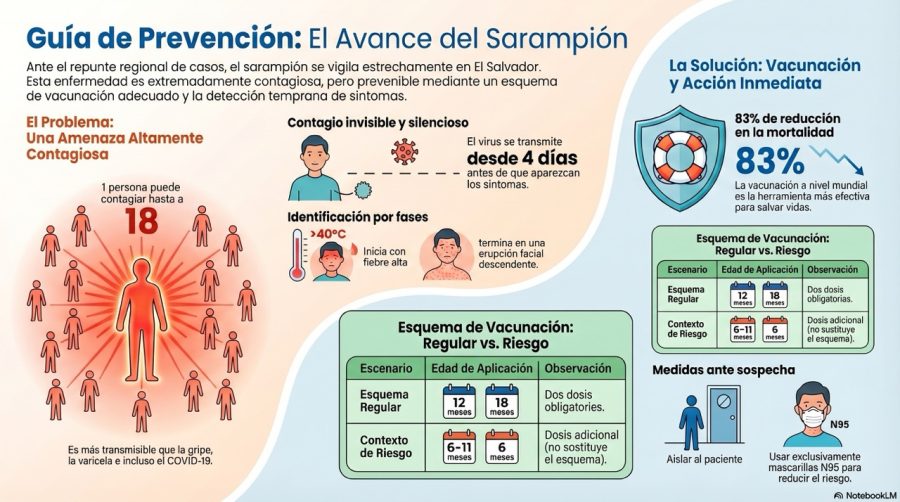 No obstante, insistió en que la vacunación sigue siendo la principal herramienta de protección y llamó a la población a completar los esquemas. En el año 1996, El Salvador había atendido su último caso de sarampión, tras la última epidemia de 1989 que dejó a 200 niños menores de cinco años muertos y una afectación de más de 10,000 personas.