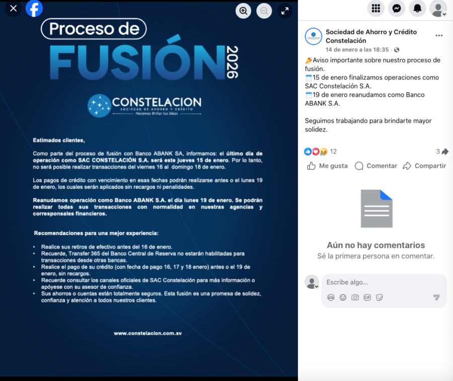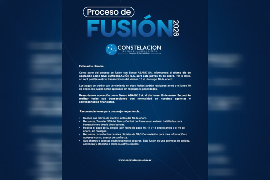 “Fortalecemos nuestra presencia en el mercado salvadoreño y reafirmamos nuestra misión de seguir impulsando el desarrollo financiero de más personas y empresas. Abank y Constelación, un solo banco”, puntualizó Constelación en diciembre pasado.