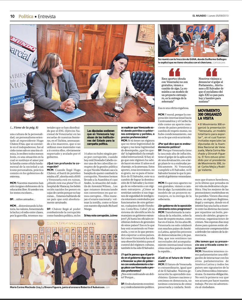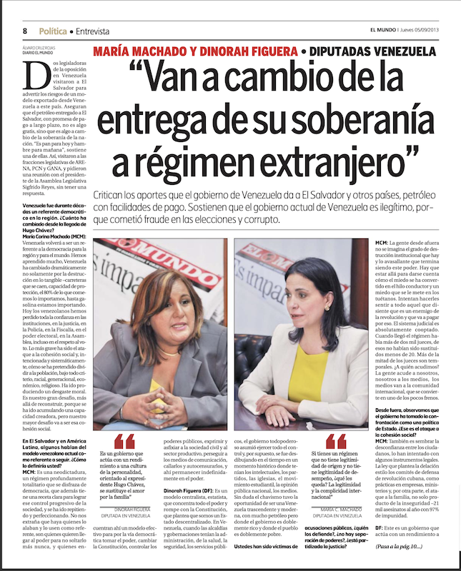Una mujer delgada y extrovertida entró en la sala de reuniones de Diario El Mundo en el centro de San Salvador una mañana de septiembre de 2013. Vestía un traje blanco de sastre con una blusa verde amarela, saludó con esa amabilidad y desenfado propio de los venezolanos, amigable, sumamente cordial. Pero cuando empezamos a dispararle nuestras preguntas, María Corina Machado respondió con el mismo temple y la firmeza con que la hemos visto enfrentar a Hugo Chávez y Nicolás Maduro, los dictadores venezolanos con los que le ha tocado lidiar desde sus días de diputada.