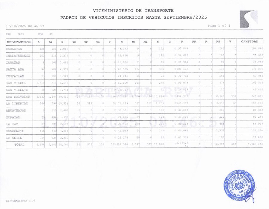 El gobierno salvadoreño acumuló 13,870 vehículos registrados con placas nacionales (N) hasta septiembre de 2025, según el último padrón vehicular divulgado por el Viceministerio de Transporte (VMT).