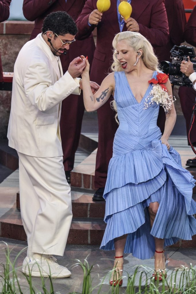 Gaga cantó y bailó salsa su canción «Die with a smile», mientras que Martin acompañó a Bad Bunny en el coro del tema «Lo que le pasó a Hawaii».