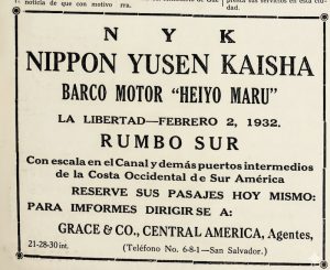 Mientras la pólvora de las armas hacía correr la sangre en China, en El Salvador ocurría otro tanto con el levantamiento etnocampesino en diversas localidades del occidente, norte y centro del territorio, donde hordas de indígenas y campesinos azuzados por el Socorro Rojo Internacional (SRI) iniciaron desde la noche del viernes 22 de enero de 1932 el primer alzamiento de filiación comunista en el continente americano. En las portadas del jueves 21, jueves 28 y sábado 30 de enero, las portadas de Diario Latino presentaron el rostro del líder capturado Agustín Farabundo (así en su partida natal) Martí, una fosa con cadáveres y la ejecución del cacique nahua Feliciano Ama. En las segundas páginas de esas ediciones, fue publicado un anuncio de significativas proporciones dentro de esos periódicos impresos en formato estándar inglés. La agencia capitalina de la Grace & Co. Central America invitaba al público a adquirir boletos para viajar a puertos sudamericanos a bordo de un buque de la Nippon Yusen Kaisha (NYK), la empresa naviera de la que el cónsul Sigüenza Mineros había escrito cuatro años antes. Para reservas, el único medio disponible era efectuar una llamada al número telefónico 6-8-1.